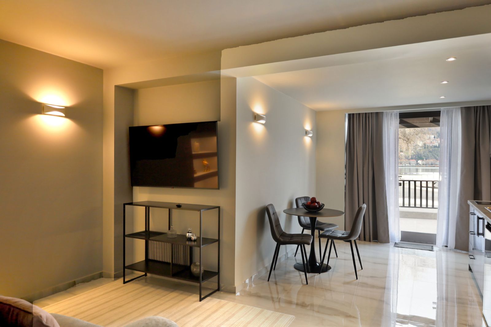 It features one bedroom, a living area with a sofa bed, two modern bathrooms, and a fully equipped kitchen, while the private terrace overlooking the lake creates an ideal space for relaxation and moments of absolute tranquility.